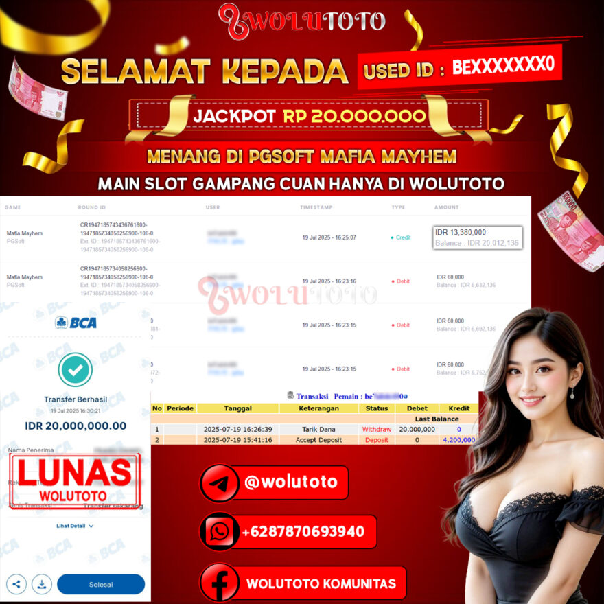 Selamat yang sebesar-besarnya kami ucapkan kepada user BE*******0 atas keberhasilannya meraih jackpot senilai Rp 20.000.000 di WOLUTOTO! Kemenangan ini menjadi salah satu pencapaian luar biasa yang kembali membuktikan bahwa WOLUTOTO adalah platform terpercaya, adil, dan selalu memberikan peluang nyata bagi setiap member untuk meraih hadiah besar.