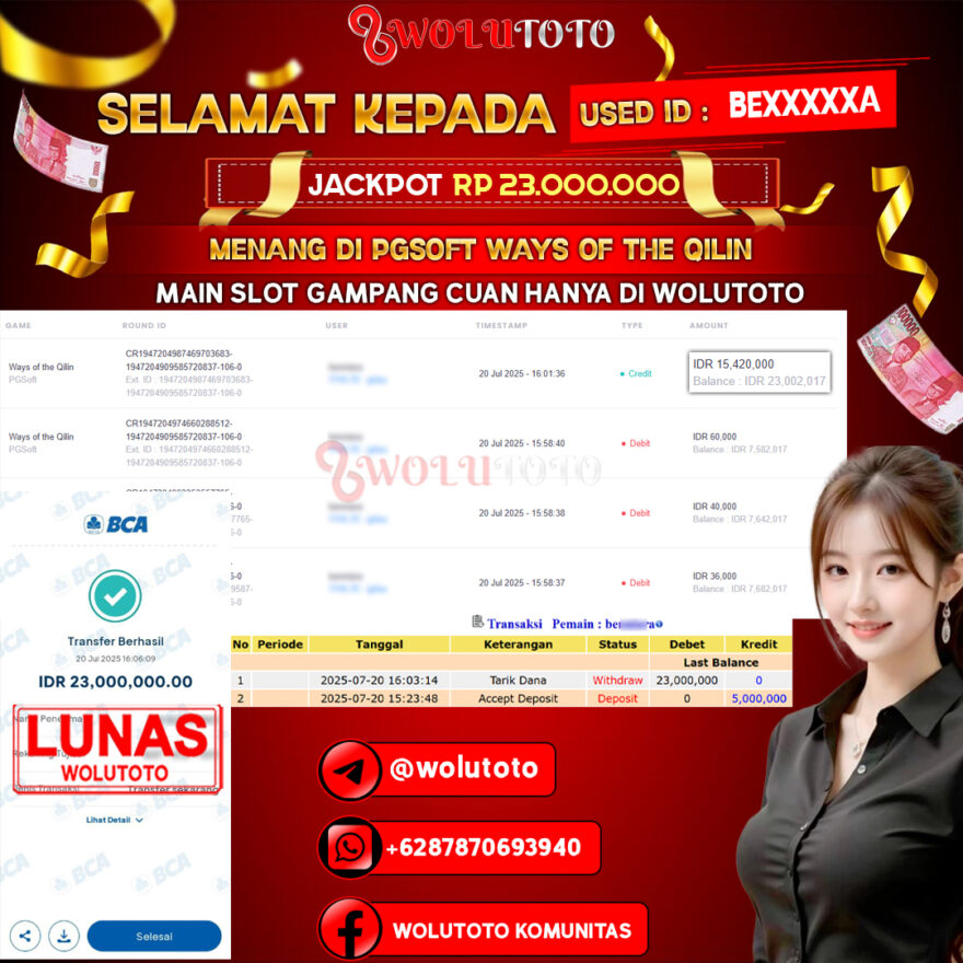 Selamat yang sebesar-besarnya kami ucapkan kepada user BE*****A atas keberhasilannya meraih jackpot senilai Rp 23.000.000 di WOLUTOTO! Kemenangan ini menjadi salah satu pencapaian luar biasa yang kembali membuktikan bahwa WOLUTOTO adalah platform terpercaya, adil, dan selalu memberikan peluang nyata bagi setiap member untuk meraih hadiah besar.