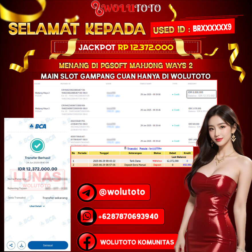 Selamat yang sebesar-besarnya kami ucapkan kepada user BR******9 atas keberhasilannya meraih jackpot senilai Rp 12.372.000 di WOLUTOTO! Kemenangan ini menjadi salah satu pencapaian luar biasa yang kembali membuktikan bahwa WOLUTOTO adalah platform terpercaya, adil, dan selalu memberikan peluang nyata bagi setiap member untuk meraih hadiah besar.