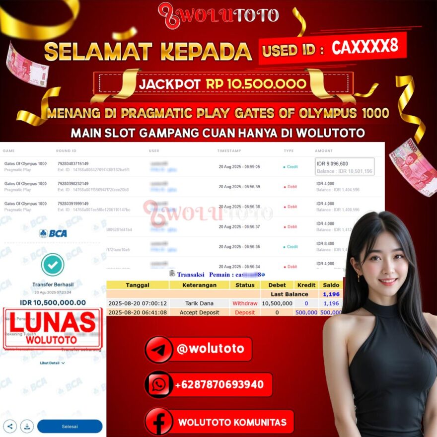 Selamat yang sebesar-besarnya kami ucapkan kepada user CA****8 atas keberhasilannya meraih jackpot senilai Rp 10.500.000 di WOLUTOTO! Kemenangan ini menjadi salah satu pencapaian luar biasa yang kembali membuktikan bahwa WOLUTOTO adalah platform terpercaya, adil, dan selalu memberikan peluang nyata bagi setiap member untuk meraih hadiah besar.
