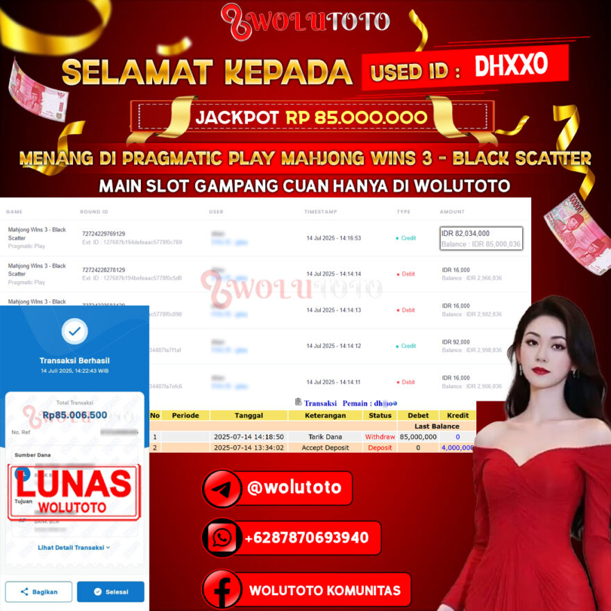 Selamat yang sebesar-besarnya kami ucapkan kepada user DH**O atas keberhasilannya meraih jackpot senilai Rp 85.000.000 di WOLUTOTO! Kemenangan ini menjadi salah satu pencapaian luar biasa yang kembali membuktikan bahwa WOLUTOTO adalah platform terpercaya, adil, dan selalu memberikan peluang nyata bagi setiap member untuk meraih hadiah besar.