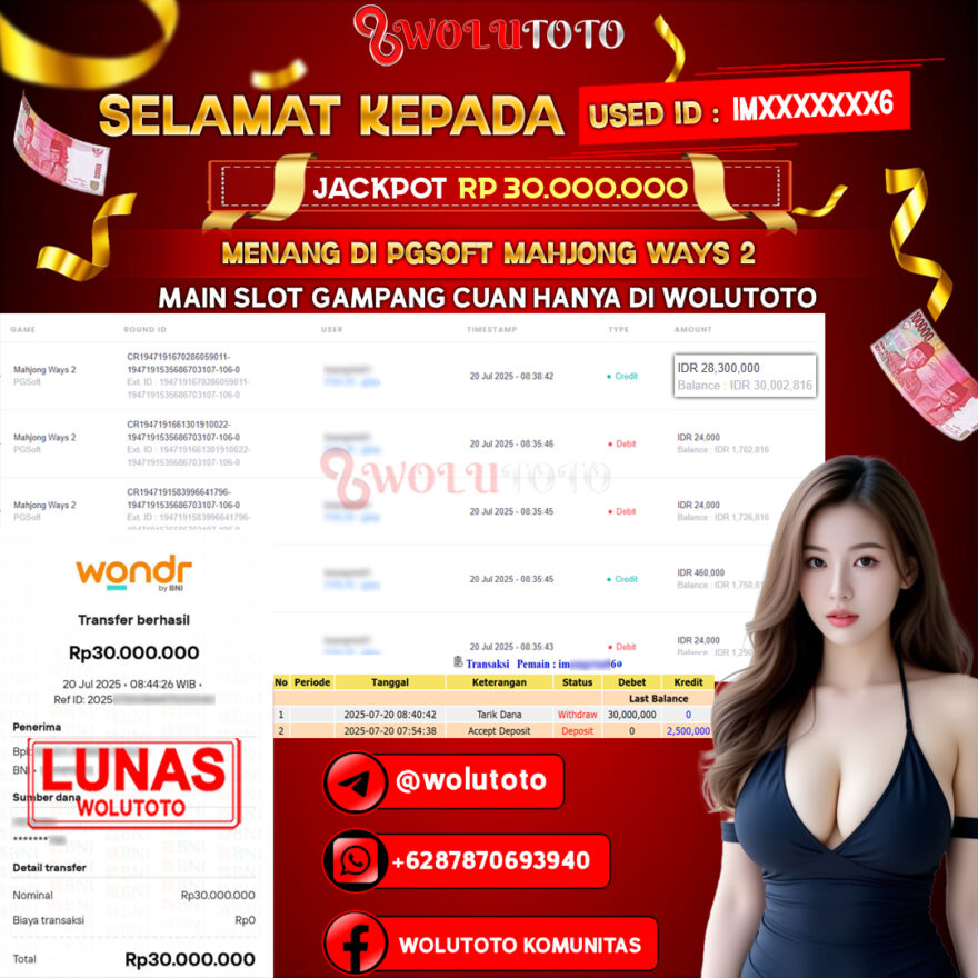 Selamat yang sebesar-besarnya kami ucapkan kepada user IM*******6 atas keberhasilannya meraih jackpot senilai Rp 30.000.000 di WOLUTOTO! Kemenangan ini menjadi salah satu pencapaian luar biasa yang kembali membuktikan bahwa WOLUTOTO adalah platform terpercaya, adil, dan selalu memberikan peluang nyata bagi setiap member untuk meraih hadiah besar.