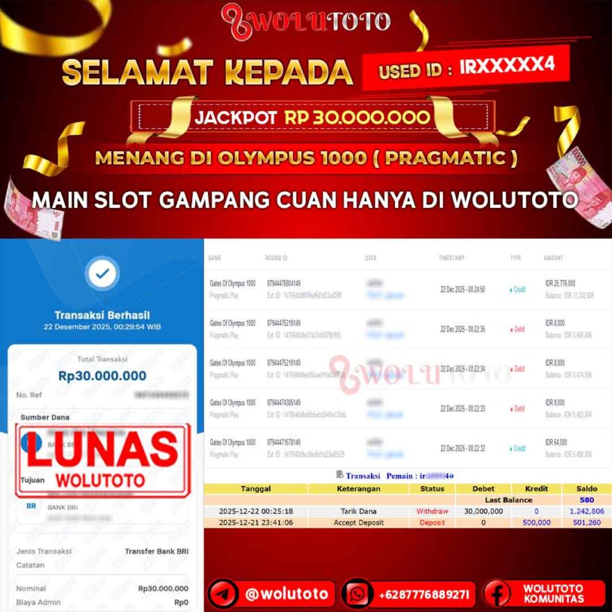 Selamat yang sebesar-besarnya kami ucapkan kepada user IR*****4 atas keberhasilannya meraih jackpot senilai Rp 30.000.000 di WOLUTOTO! Kemenangan ini menjadi salah satu pencapaian luar biasa yang kembali membuktikan bahwa WOLUTOTO adalah platform terpercaya, adil, dan selalu memberikan peluang nyata bagi setiap member untuk meraih hadiah besar.