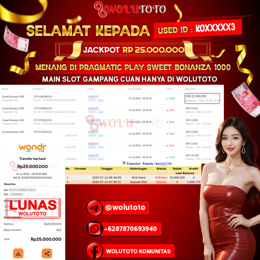 Selamat yang sebesar-besarnya kami ucapkan kepada user KO*****3 atas keberhasilannya meraih jackpot senilai Rp 25.000.000 di WOLUTOTO! Kemenangan ini menjadi salah satu pencapaian luar biasa yang kembali membuktikan bahwa WOLUTOTO adalah platform terpercaya, adil, dan selalu memberikan peluang nyata bagi setiap member untuk meraih hadiah besar.