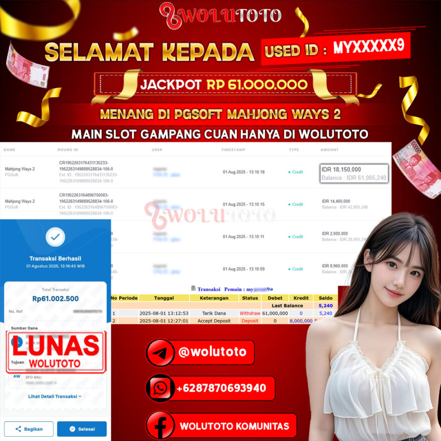 Selamat yang sebesar-besarnya kami ucapkan kepada user MY*****9 atas keberhasilannya meraih jackpot senilai Rp 61.000.000 di WOLUTOTO! Kemenangan ini menjadi salah satu pencapaian luar biasa yang kembali membuktikan bahwa WOLUTOTO adalah platform terpercaya, adil, dan selalu memberikan peluang nyata bagi setiap member untuk meraih hadiah besar.