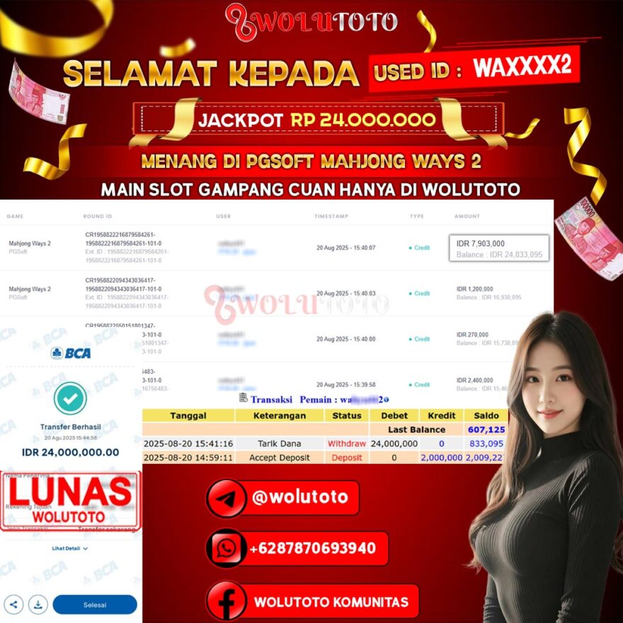 Selamat yang sebesar-besarnya kami ucapkan kepada user WA****2 atas keberhasilannya meraih jackpot senilai Rp 24.000.000 di WOLUTOTO! Kemenangan ini menjadi salah satu pencapaian luar biasa yang kembali membuktikan bahwa WOLUTOTO adalah platform terpercaya, adil, dan selalu memberikan peluang nyata bagi setiap member untuk meraih hadiah besar.